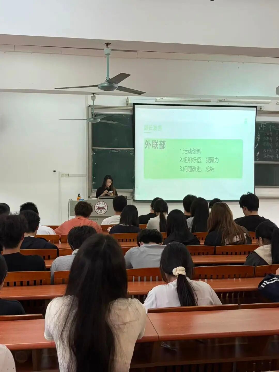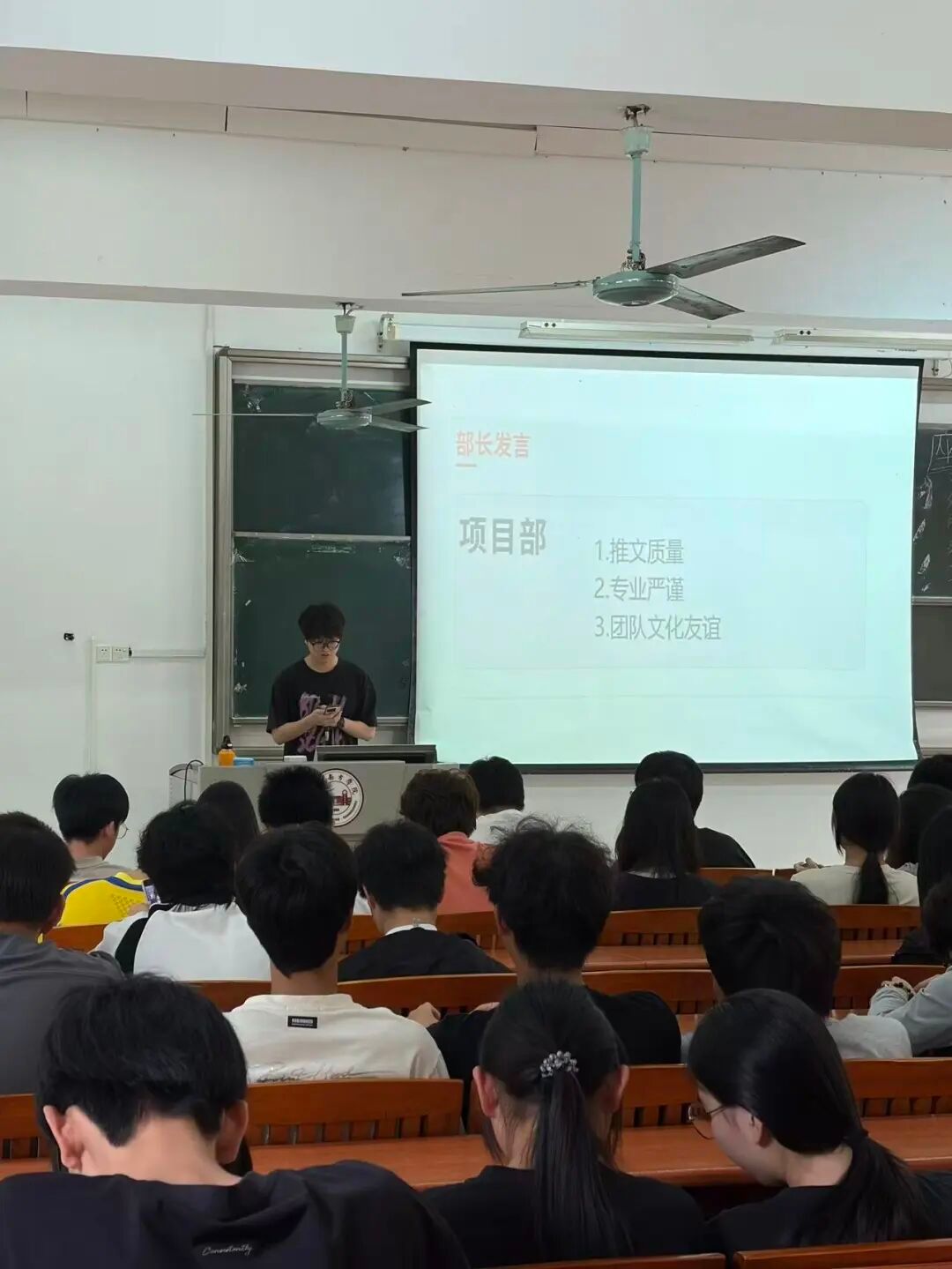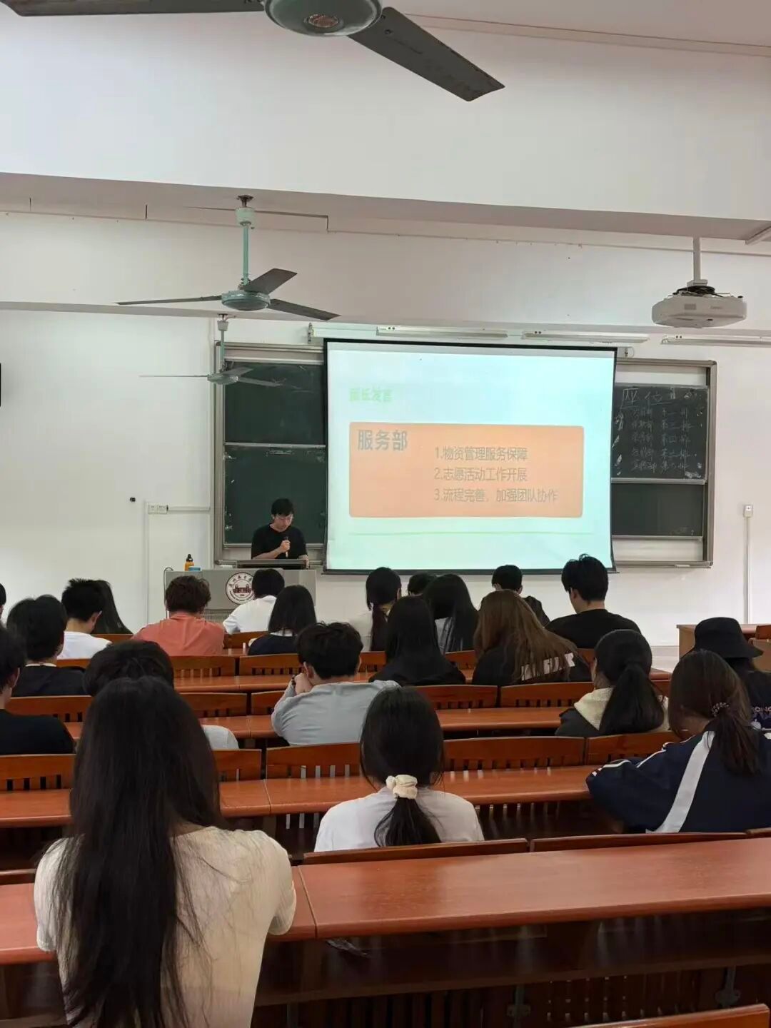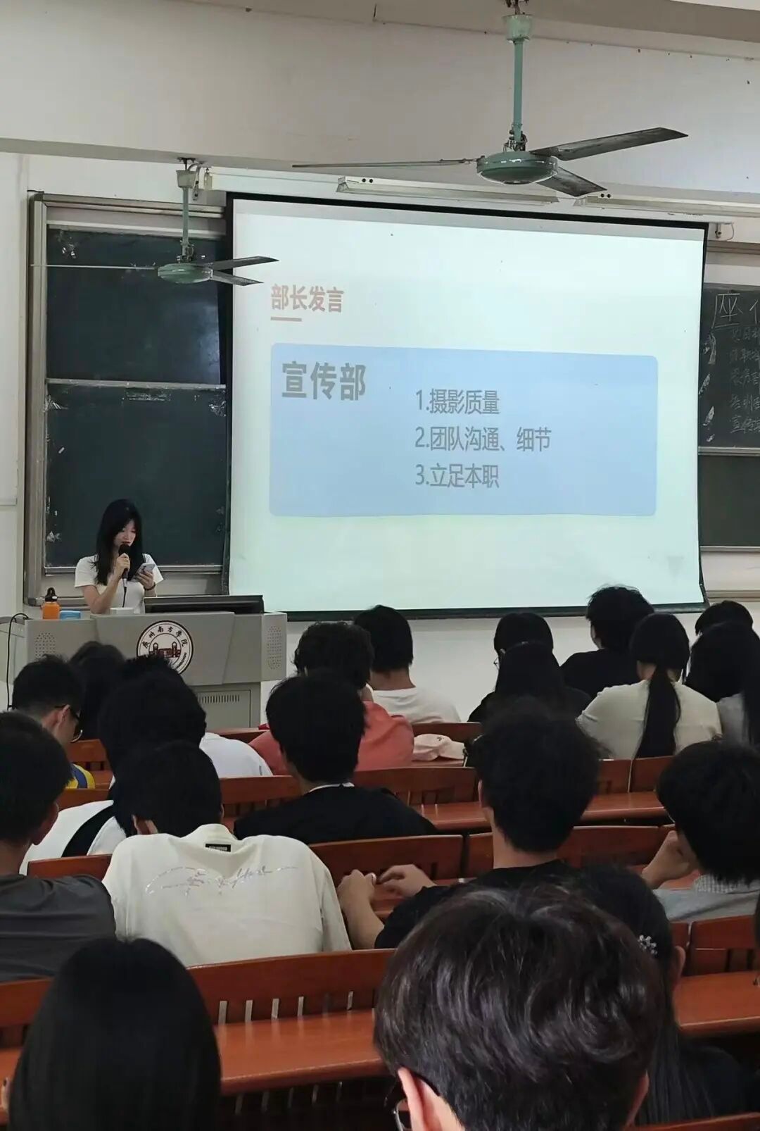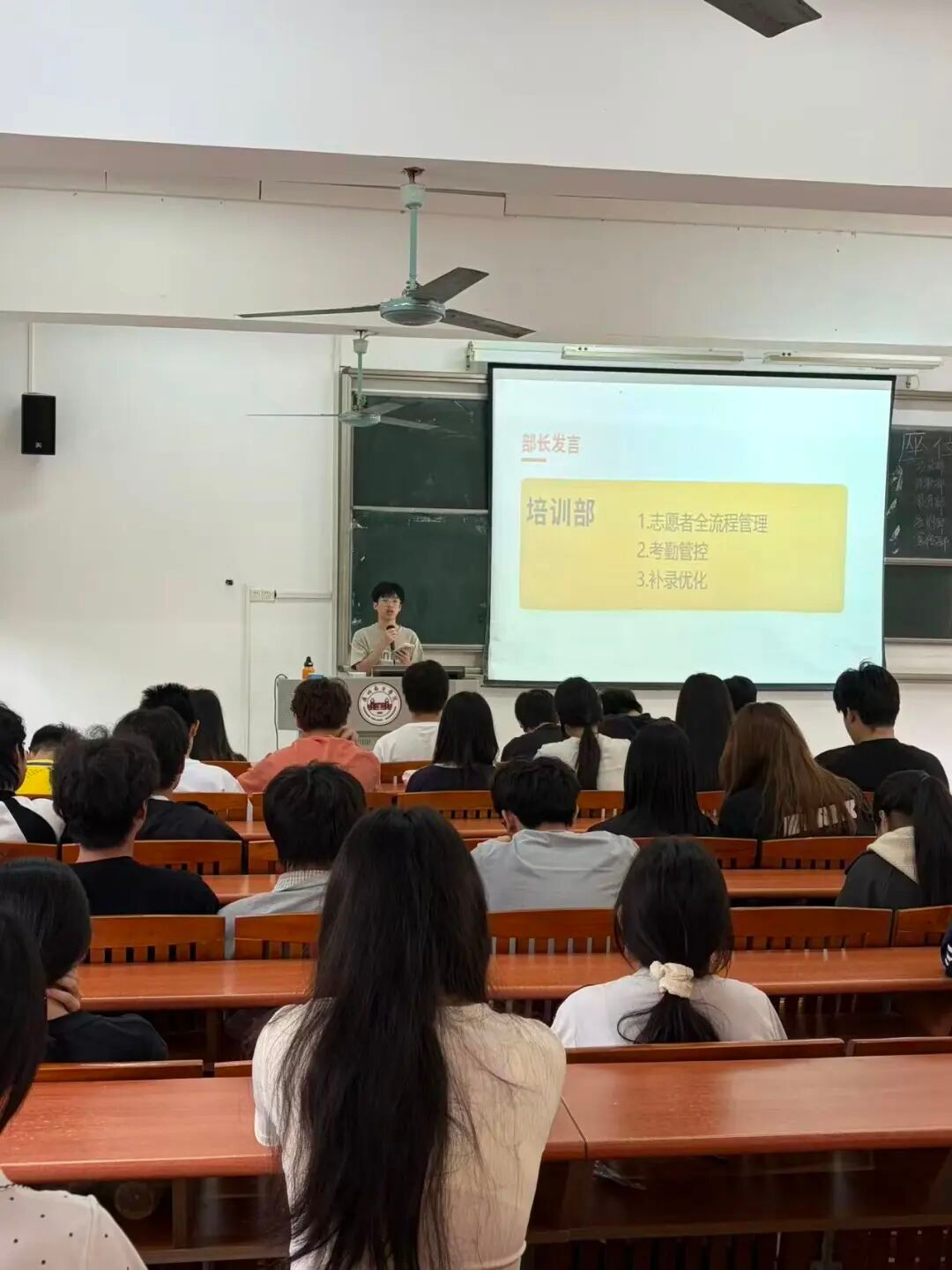 各部门负责人依次汇报工作,项目部打磨推文、兼顾专业与团队建设;外联部优化活动创新和标识问题、带动组织氛围;服务部做好物资场地保障、将完善流程强协作;培训部考勤实现0补录、部门互学共进;宣传部复盘短板,将从统一标准、保障素材、内部学习提升工作。