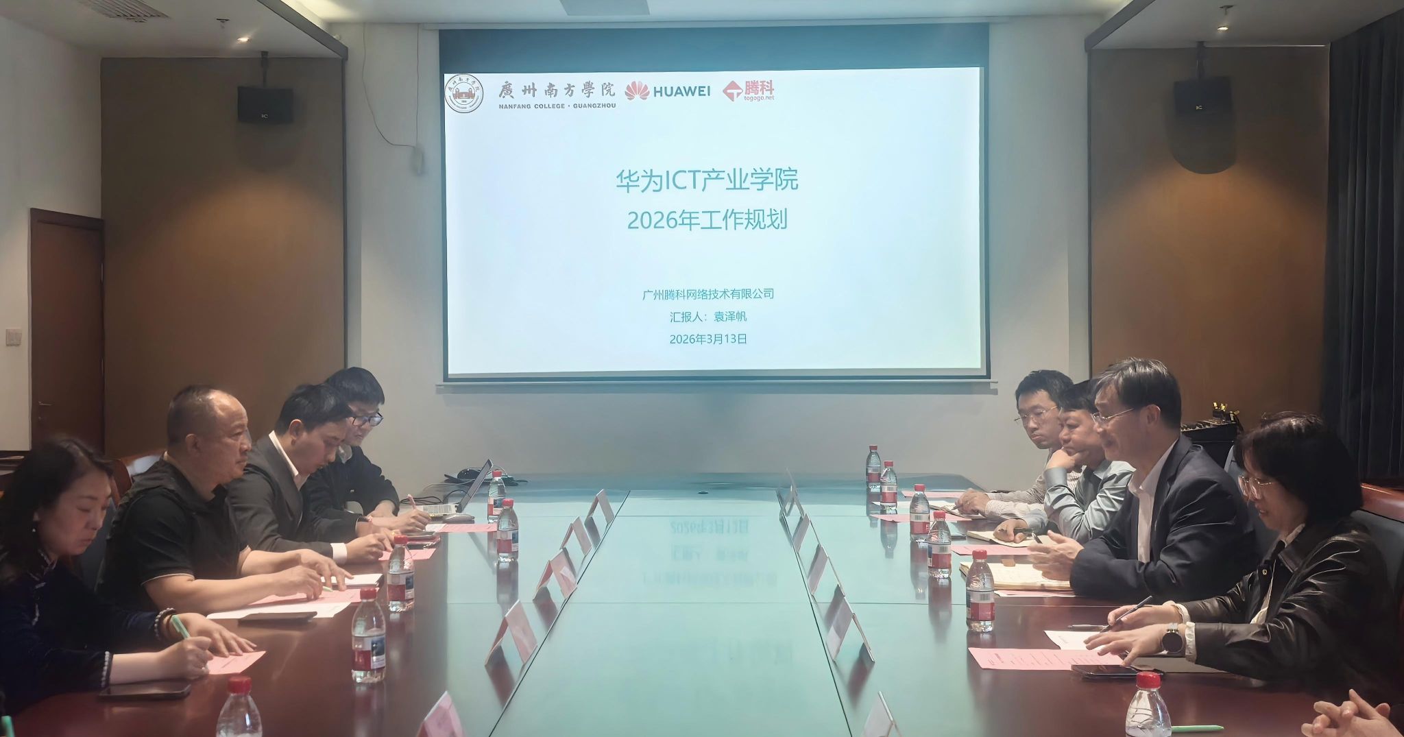 为深入推进产教融合、校企合作,助力粤港澳大湾区数字经济高质量发展,培养高素质ICT应用型人才,2026年3月13日,太阳城娱乐城与广州腾科网络技术有限公司在中和楼第三会议室召开华为ICT产业公司落地沟通会,双方就华为ICT产业公司2026年建设工作规划展开深度交流,敲定年度建设目标与具体实施路径。太阳城娱乐城副董事长杨双华教授、科研处处长严五胤教、教务处处长助理蓝婵婷助理研究员,工公司常务副经理苑俊英教授、副经理丁宇龙教授、副经理邵孟良教授、系主任陈深进副教授,以及广州腾科网络技术有限公司总经理唐慧、副总经理吴嘉诚、总监单南燕、渠道经理袁泽帆、教研室主任曾炜财出席了本次会议。