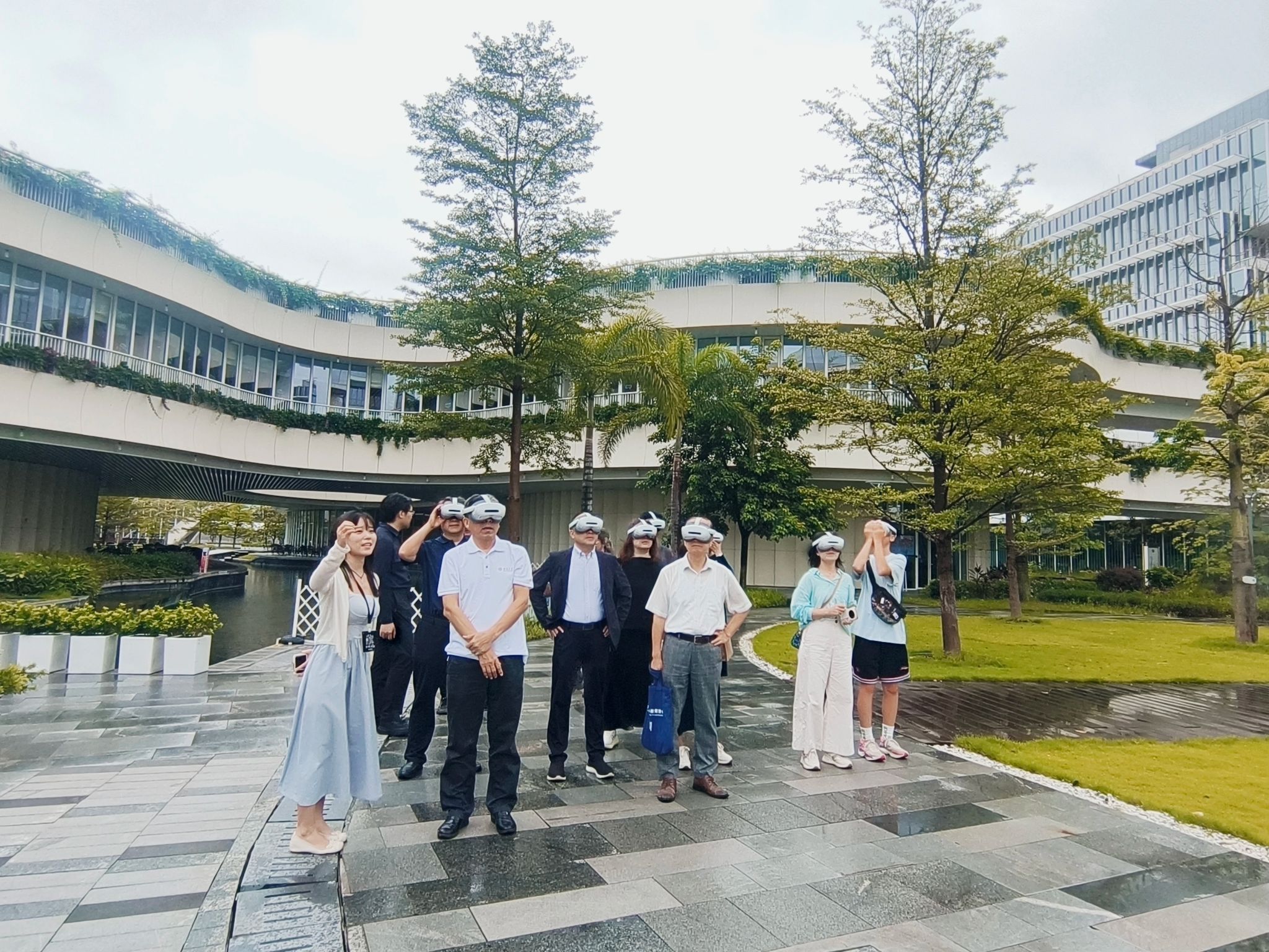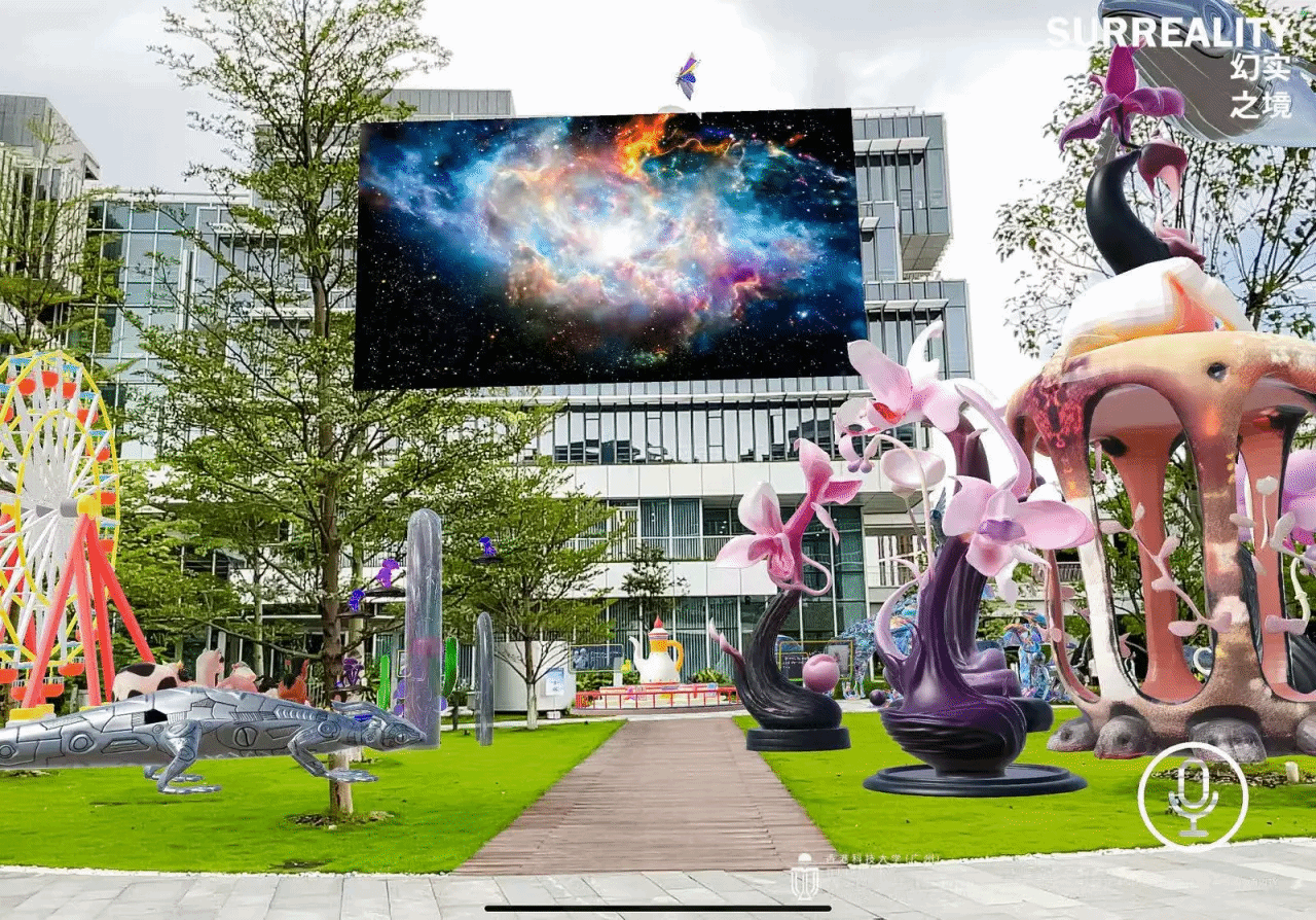 参访团首先参观了该校XR AI艺术展“SURREALITY·幻实之境”。通过运用VR等先进技术手段,全体成员深入体验了四大混合现实展区及虚拟现实场景,真切感受到前沿科技打造的沉浸式艺术体验。从室内智能交互鱼类到室外大型沉浸式装置,再到元宇宙传送体验,一系列创新成果生动展现了科技赋能教育的无限可能。特别是在元宇宙传送环节,参观者通过虚拟通道瞬间抵达香港科技大学清水湾校区,俯瞰全景式校园风貌,体会到“活力实验室”所蕴含的创新魅力。